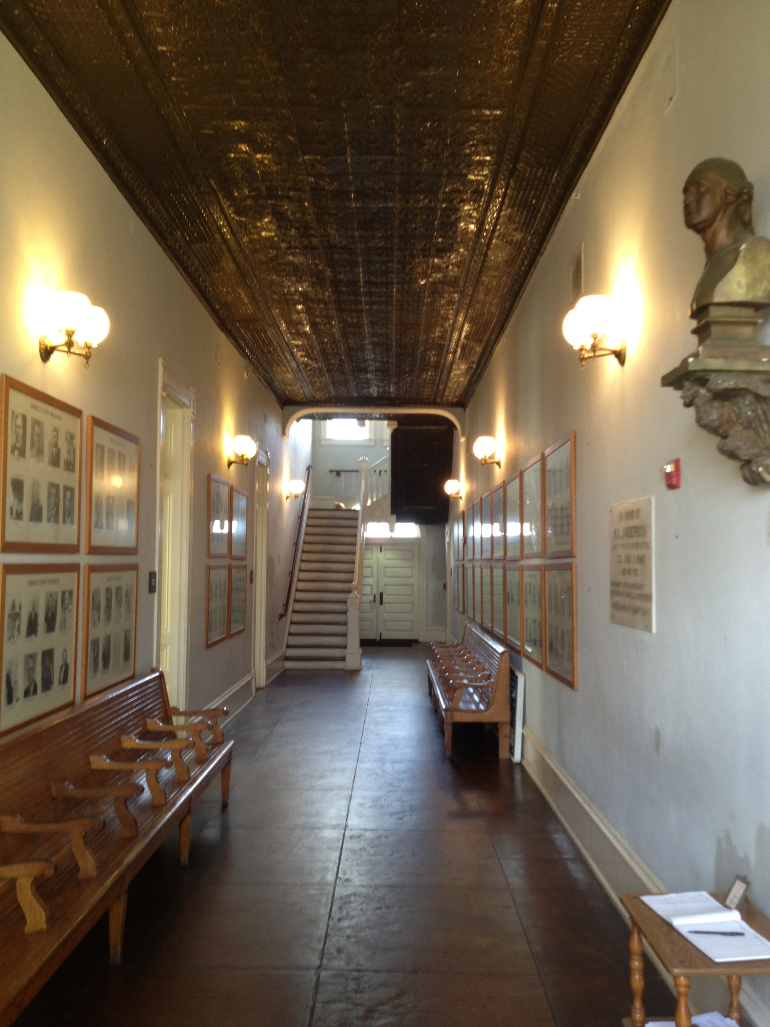 Overhead, the ornate detailing of the stamped-tin ceiling looked bronze in the afternoon light. A nice woman came out of a doorway and invited us to go upstairs and look around. At the top of a steep flight of stairs, we found two dimly lit courtrooms. We stepped inside one, but we didn’t stay long. We didn’t explore the stairway upwards to the third floor; and we didn’t attempt a photo. And while on the second floor, we spoke to each other in whispers.