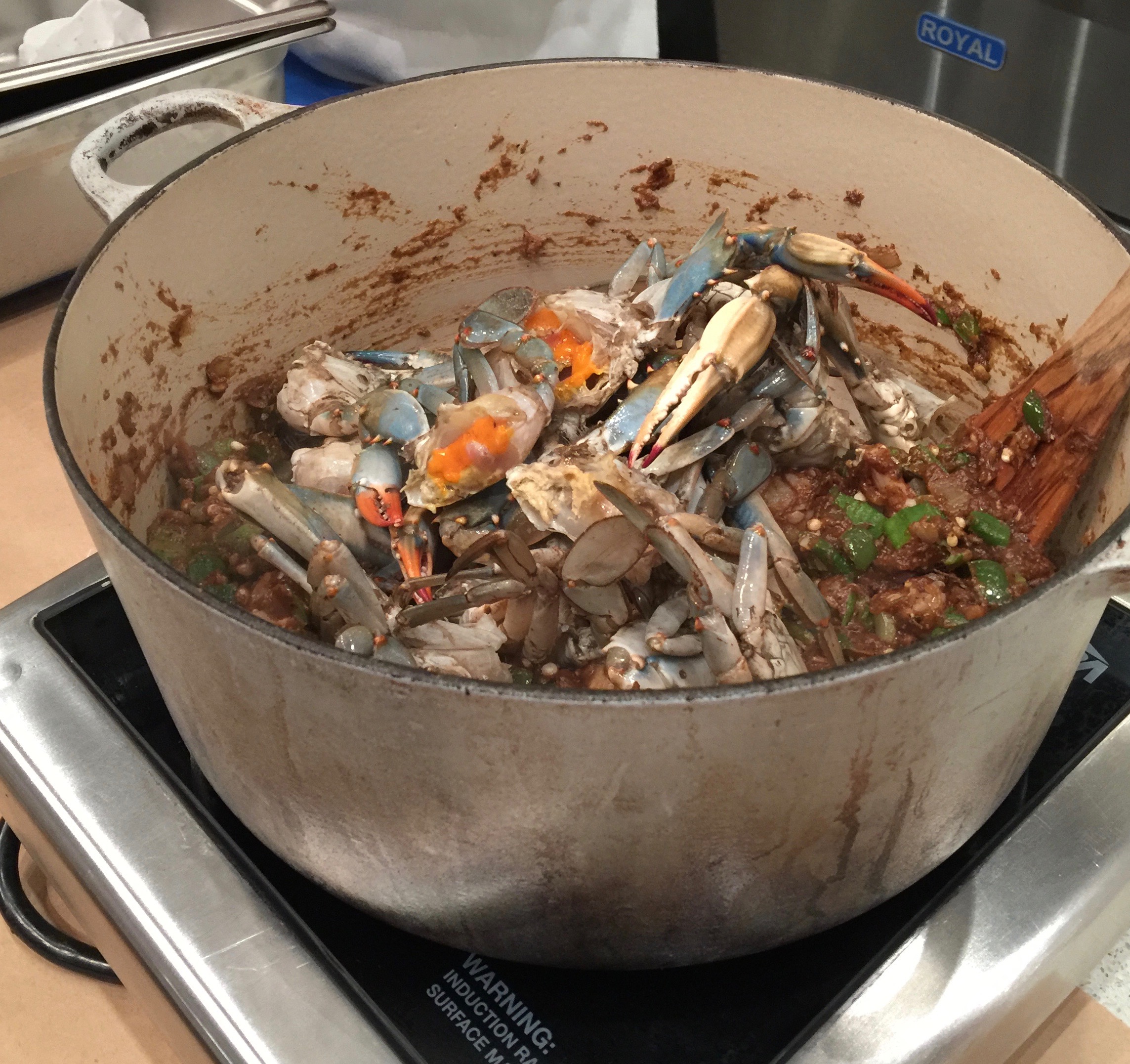 We knew it had to be time for the fish stock. It just had to be or the whole thing would ruin, but they told us to add the cleaned crabs and stir again. Really!
